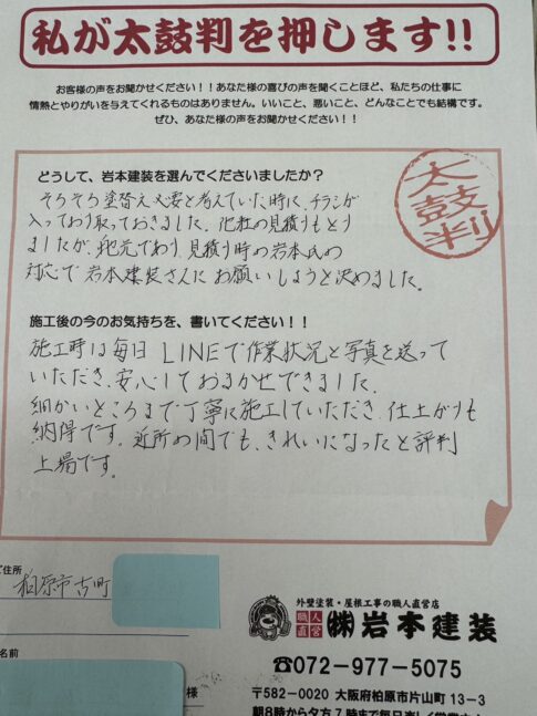 そしてこれらが、岩本建装が1棟1棟『魂』を込めた塗装工事をお約束させていただくという意味でございます。こんな私たちですが、2回目・3回目の塗装工事や人生最後の塗替えをご検討されている方は、是非、ぜひ一度、お声掛けくださったら嬉しいです。必ずご満足いただける塗装工事をお約束いたします。