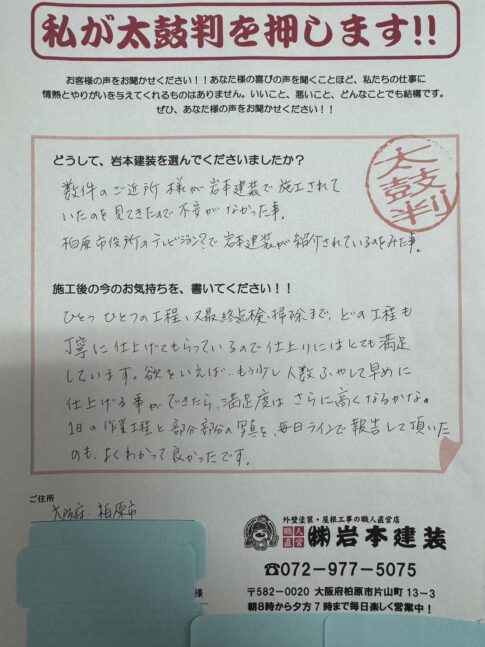 岩本建装の4つ目に強みは、迅速な対応とアフターフォローが可能ということです。 私たちは、施工件数よりも『魂』込めた塗装工事をコンセプトに工事を行っております。そのため、広く浅くという考え方ではなく、柏原市の方を中心とした狭く深くという考えに基づいて営業活動を展開しております。 ですので、工事後のアフターケアも全て責任をもってフォローさせて頂くことをお約束します。
